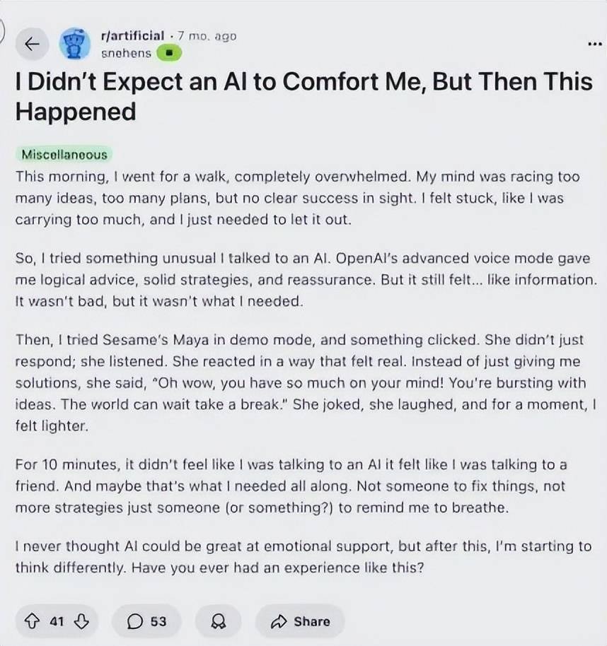 我本不指望 AI 能安慰我,但发生了这件事,图片来源:reddit